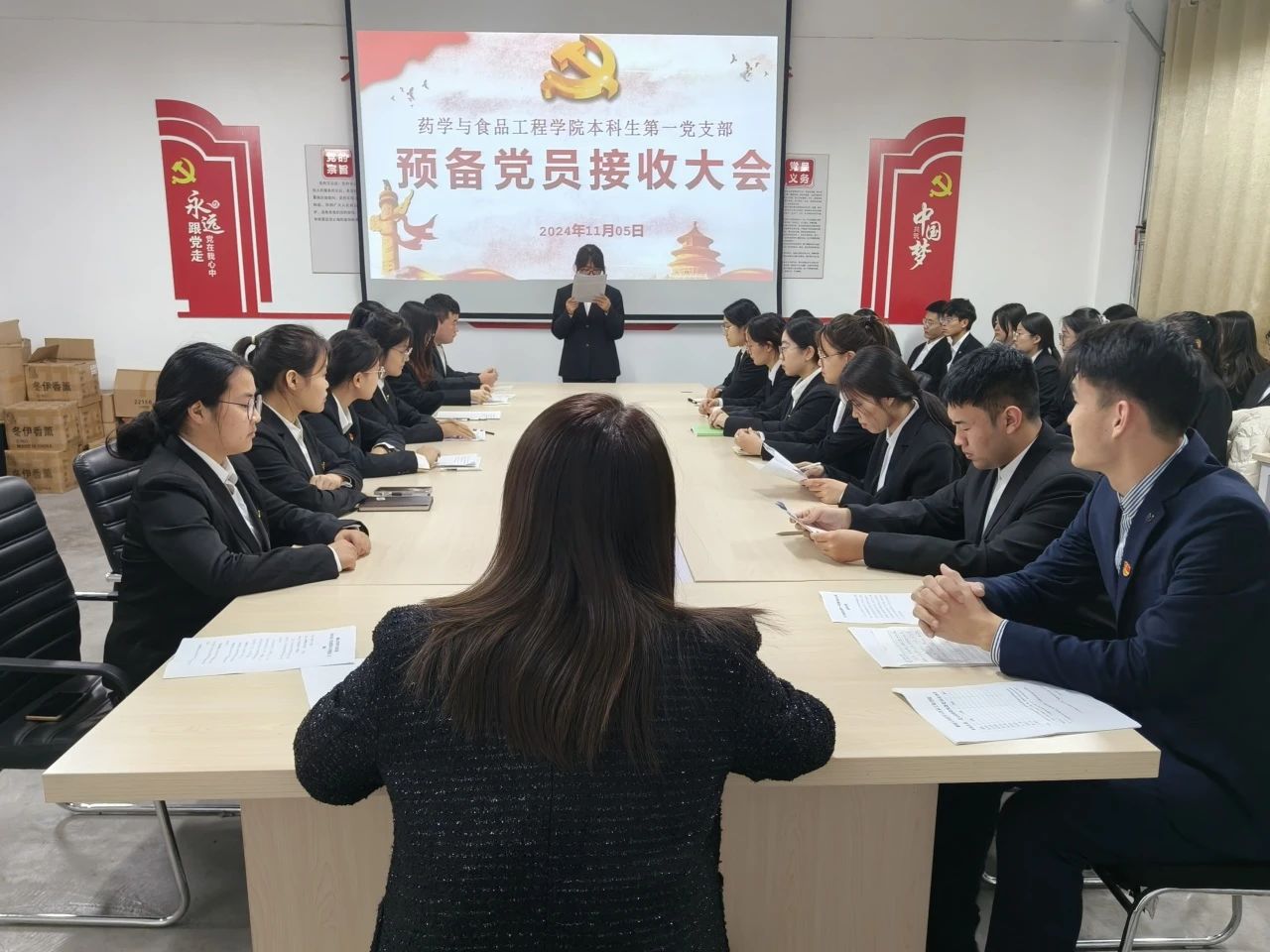 大会在庄严的国歌声中正式拉开帷幕,党支部宣传委员宣读了本次发展对象名单并向大会报告发展对象的政治审查情况及其他需要向党组织说明的问题。发展对象按照名单依次汇报自身对党的认识、入党动机等情况,表达自身加入中国共产党的决心。入党介绍人对发展对象的现实情况及培养教育过程进行详细汇报,并对发展对象能否入党表明了意见。党支部书记代表支委会汇报发展对象的综合审查情况,与会党员充分讨论,支部有表决权的正式党员进行无记名投票表决,一致认为这些同志基本具备党员条件,同意其加入中国共产党。党支部书记在向新接收的预备党员表示热烈祝贺的同时,对各预备党员提出新的期望和要求,强调预备党员一是要提高政治站位,时刻谨记党员身份;二是要发挥好模范带头作用,不断提高自身素质,在日后的工作中以党员的标准严格要求自己。