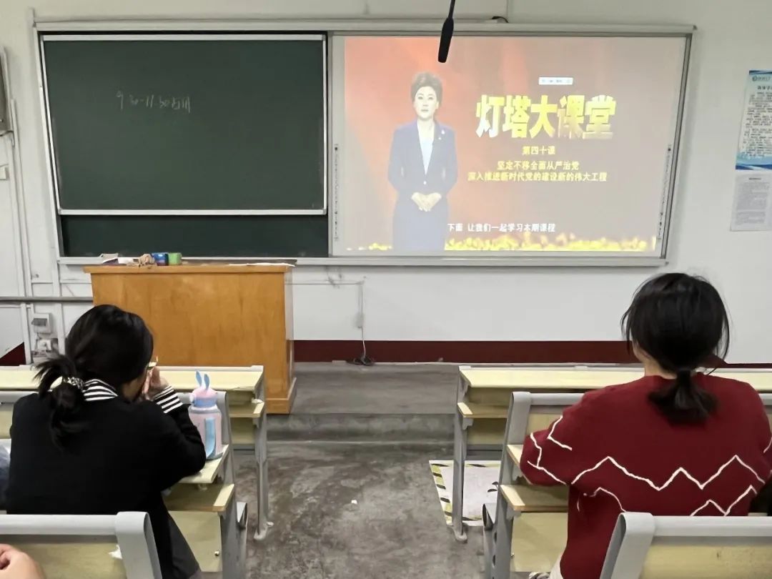 本次《灯塔大讲堂》课程名称为《坚定不移全面从严治党,深入推进新时代党的建设新的伟大工程》,主讲人中共中央党校党的建设教研部副主任、教授祝灵君,本次课程重点从坚持党的自我革命永远在路上、坚持和加强党中央集中统一领导、坚持不懈用习近平新时代中国特色社会主义思想凝心铸魂、增强党组织政治功能和组织功能等8个方面对全面从严治党、党的建设有关内容进行解析,通过解读全面从严治党的科学内涵和重大意义,教育引导广大党员了解掌握主题教育的根本任务和目标要求,深刻认识主题教育的重要意义。其内容主要讲述了全面建设社会主义现代化国家、全面推进中华民族伟大复兴,关键在党,经过不懈努力,党找到了自我革命这一跳出治乱兴衰历史周期率的第二个答案。在观看过程中,党员们认真观看,及时记录。观看结束后,学生结合自己的成长经历纷纷发表自己的认识与感想,并表示在今后的工作和学习生活中,将进一步立足自身岗位,不忘初心跟党走,坚定理想信念,努力锤炼本领,励志做有理想、敢担当、能吃苦、肯奋斗的新时代青年。