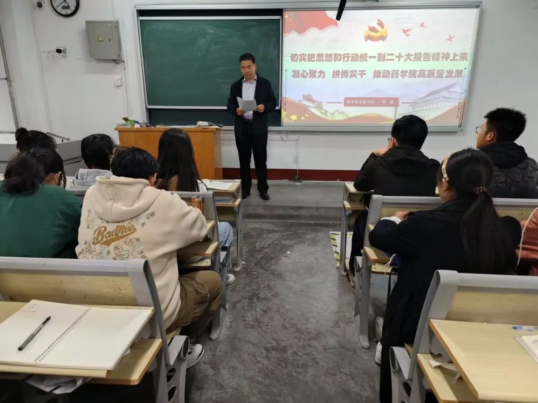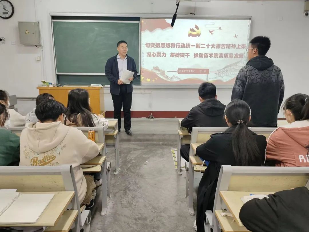同时,程书记提出“爱国爱党就要爱校爱院”,呼吁学生要将行动落实到方方面面,为药学院的发展出一份力,并且要求学生要认真对待考试,端正态度,指出把手头的事做好就是为国家做贡献。最后程书记引用习近平总书记在党的二十大上的一段话:青年强,则国家强。当代中国青年生逢其时,施展才干的舞台无比广阔,实现梦想的前景无比光明。广大青年要坚定不移听党话、跟党走,怀抱梦想又脚踏实地,敢想敢为又善作善成,立志做有理想、敢担当、能吃苦、肯奋斗的新时代好青年,让青春在全面建设社会主义现代化国家的火热实践中绽放绚丽之花。