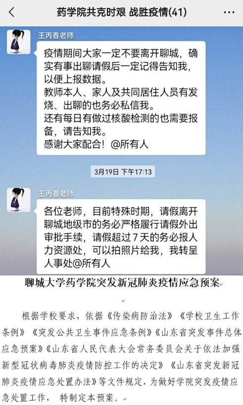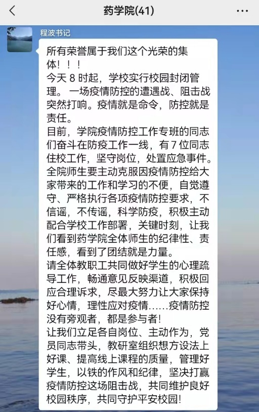 在接到学校疫情防控工作安排后,药学院闻令行动,紧急召开学院党委会议,传达学校疫情防控工作文件精神,成立学院疫情防控工作专班,制定《药学院突发新冠肺炎疫情应急预案》,通过微信群、微信公众号、学院官网等平台实时发布疫情防控工作政策、通知和动态,组织7名党员教师住校工作,投身学院疫情防控第一线。