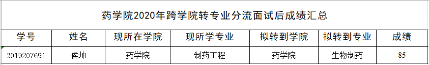 药学院2020年跨学院转专业分流面试后成绩汇总
