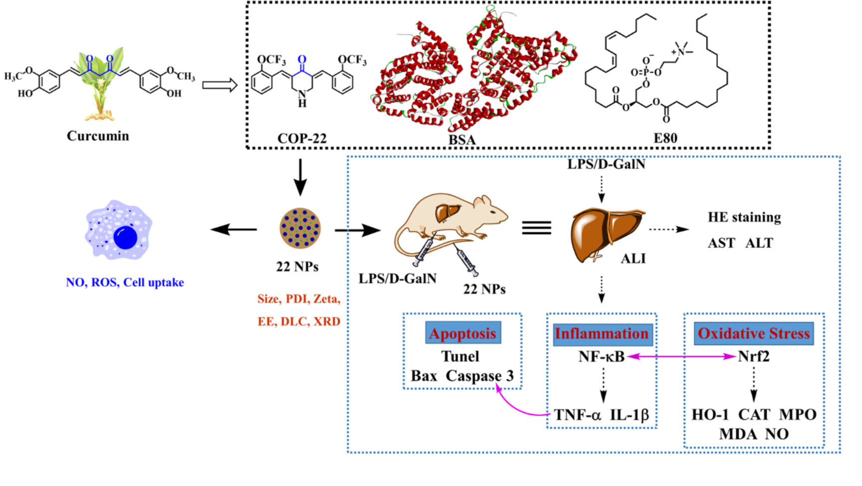 在本研究中,制备了负载COP-22的牛血清白蛋白(BSA)纳米粒(22纳米粒),并具有特征的。它们通过抑制炎症、氧化应激和炎症反应,显示出有效的肝脏保护作用脂多糖/D-半乳糖胺诱导的小鼠急性肝损伤的应激和细胞凋亡。COP-22蛋白纳米粒的抗炎活性与NF-κB信号通路的调节有关;抗氧化活性与调节Nrf2信号通路有关;细胞凋亡活性与线粒体途径有关,涉及Bcl-2家族和Caspase-3蛋白。这些三种细胞途径相互关联,相互影响。此外,与化合物22的盐酸盐相比,COP-22蛋白纳米粒更易被吸收,并可通过滞留作用靶向积聚在肝脏中。