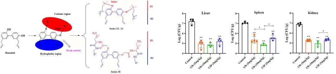 团队基于天然抗菌活性成分和厚朴酚的骨架架构,通过引入多种亲水性正电荷和亲脂性侧链,构建与抗菌肽类似的两亲性结构,以期获得具有成药前景的抗菌肽模拟物。通过活性筛选发现,化合物13b的抗菌活性最佳,与对照药物多粘菌素和万古霉素的抗菌活性相当,而且该化合物还表现出抗菌谱广、杀菌速度快,不易产生耐药性等诸多特点。另外,该化合物不仅能够抑制生物膜的形成,还可以破坏预先形成的生物膜。在体内实验中,化合物13b在金黄色葡萄球菌ATCC43300诱导的小鼠脓毒症模型中表现出显著的体内抗菌活性。进一步的机理研究表明,化合物13b通过破坏细菌的细胞膜从而迅速杀死细菌。因此,该化合物表现出了作为抗菌剂的巨大潜力,可为进一步的抗菌药物研究提供结构基础。