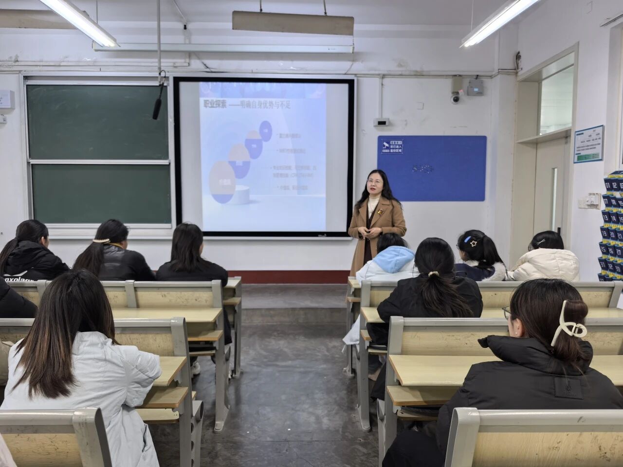 活动伊始,王秀平围绕职业探索与形势分析、职业定位与发展路径、职业技能提升三方面进行宣讲。王秀平结合2025届高校毕业生的最新数据,剖析了当前就业市场的现状,并借助性格测试工具,引导学生认知自我、明确职业适配方向。接着,她深入阐述了价值观对职业选择的影响,针对考研深造、企业就业、考公考编等发展方向,为学生梳理了差异化的成长路径。同时,她提出了切实可行的能力提升建议,包括考取专业证书、参与实习实践、积累行业项目经验等,针对计划深造的学生,她特别建议可重点关注985、211高水平院校,借助优质教育平台为长远发展奠定基础。在师生交流环节中,学生围绕职业规划困惑、备考安排、行业发展前景等问题踊跃提问,王秀平结合行业动态与自身经验逐一解答。
