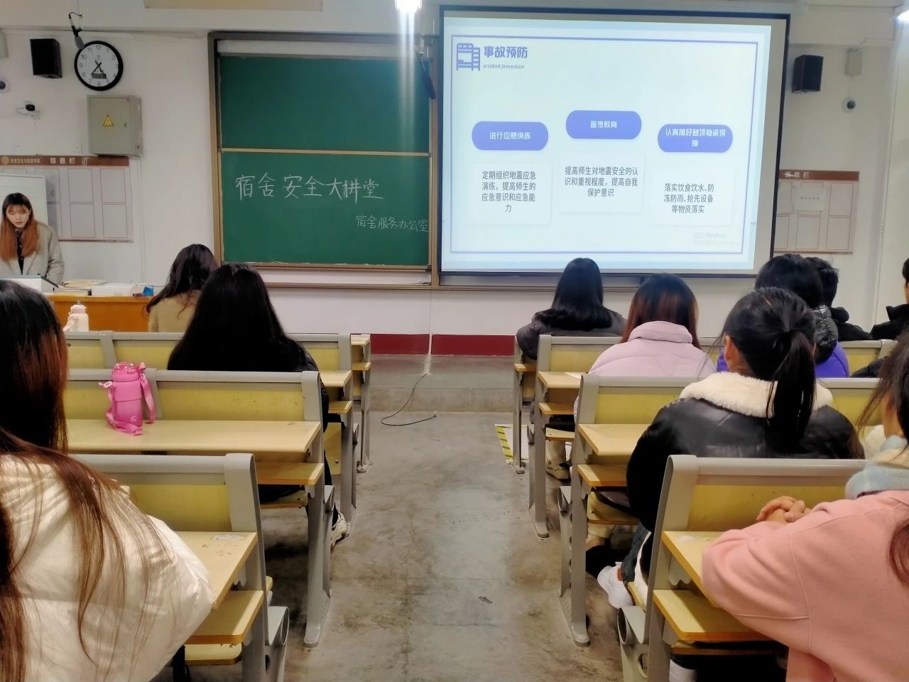 本次大讲堂主要围绕三方面展开。一是地震灾害的预防和应对。主讲人禹艺菲强调在日常生活中要以预防为主,包括定期进行应急演练、加强宣传教育、认真做好各项物资保障等等。当地震发生时,务必保持镇静,按照逃生路线有序逃离。二是火灾的防灾减灾措施。火灾预防须做到“四不”:不在宿舍内使用大功率电器、不乱拉电线、不焚烧杂物、不乱扔烟头,此外严禁在公寓楼道内和消防疏散通道口停放自行车或堆放杂物,除此之外还要熟悉灭火器的基本使用方法,当火灾来临时保持冷静、正确灭火。三是谨防校园诈骗。主要包括推销诈骗、校园贷款、兼职求职诈骗、传销陷阱、冒充角色诈骗、网络购物诈骗、虚假中奖信息诈骗等,在遇到上述情况时,要及时向班主任和保卫处反映,以免造成重大经济损失。最后禹艺菲提醒各位同学,一定要提高警惕,遵纪守法,做一名文明、健康、有为、诚信的大学生。