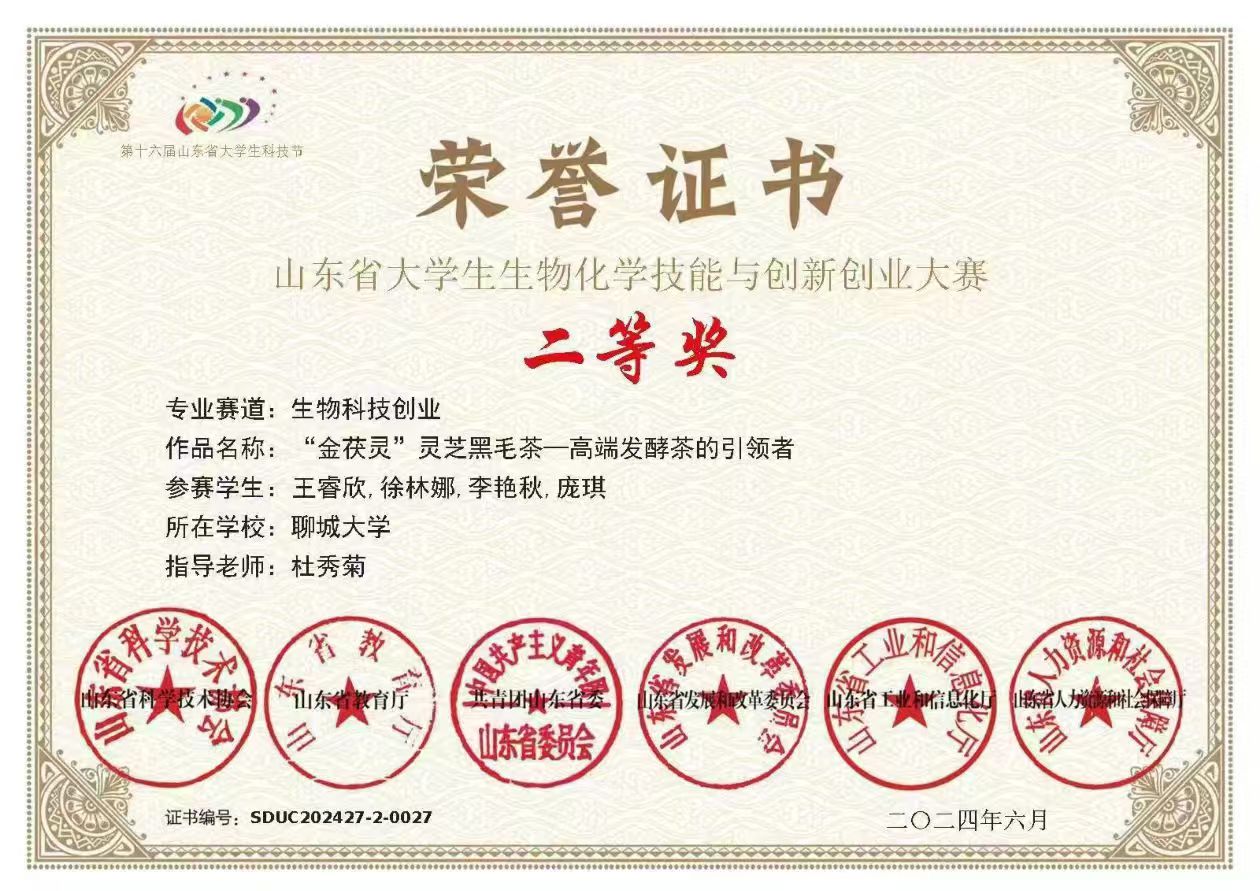 热烈祝贺 杏吧 李艳秋荣获“山东省大学生生物化学技能与创新创业大赛(2024,创新创业类)”二等奖