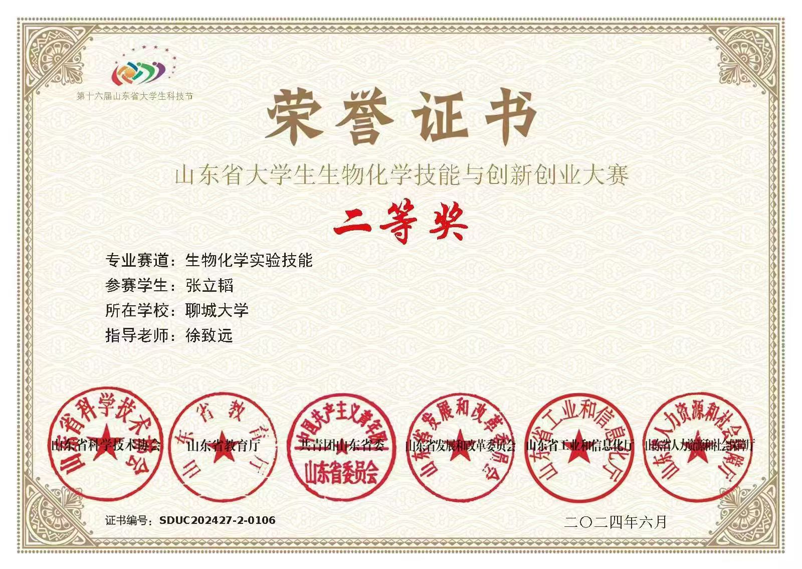 热烈祝贺 杏吧 张立韬荣获“山东省大学生生物化学技能与创新创业大赛(2024,创新创业类)”二等奖