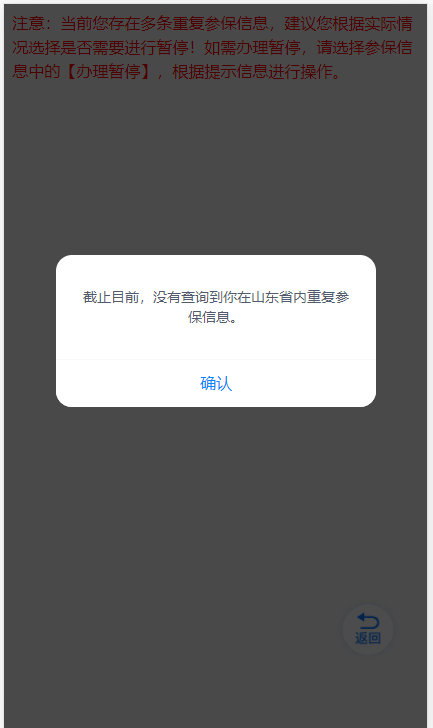 如果参保人员未重复参保,提示:“截止目前,没有查询到你在山东省内重复参保信息。”(如左图)如果参保人员重复参保,会出现下面重复参保查询界面(如右图)。
