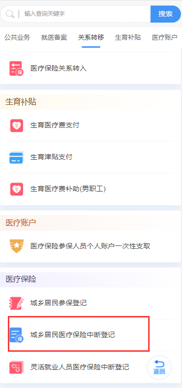 (二)如果您重复参保查询的人员类别是“居民”,参保人员可通过支付宝或微信搜索户籍地所在地市医保小程序(比如您的户籍地是聊城,微信或支付宝搜索【聊城医保】小程序),登录小程序, 主页 找到【我要办事】,点击【城乡居民医疗保险中断登记】,按提示要求办理即可。