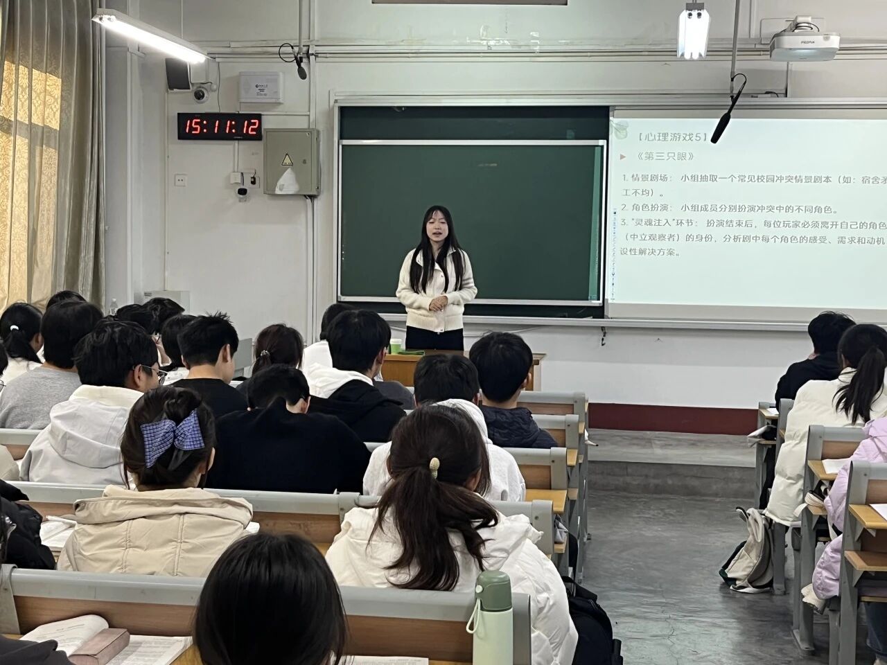 活动伊始,信瑞娟以视频《蛤蟆先生去看心理医生》为切入点,用生动具象的画面解析蕴含的心理成长主题。同时,她引导同学们围绕“情绪识别”“压力来源”“沟通模式”三个方面展开讨论,并结合自身实践经历,系统阐释了心理调适在个人成长与人际交往中的重要意义,为同学们提供了科学的心理疏导思路与方法。随后,信瑞娟组织同学们分组进行“角色交换对话”“情景模拟”多种体验式游戏,让同学们在轻松的氛围中练习识别情绪,学习化解冲突的沟通技巧。活动结束后,同学们纷纷表示,此次活动强化了自我认同与抗压韧性,增强了心理调适能力。