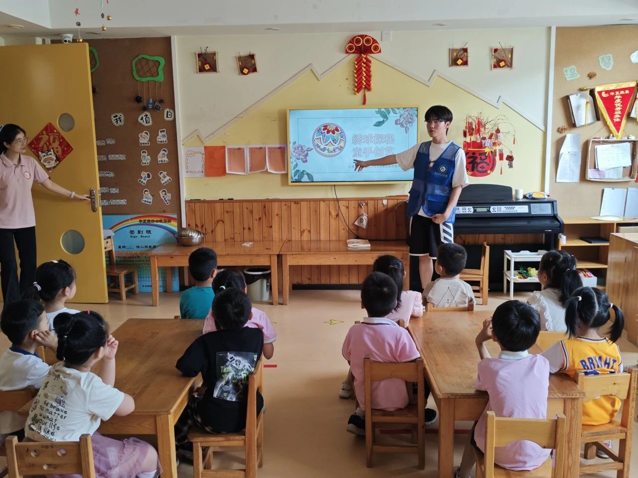 活动伊始,团队成员以生动的故事和图片向孩子们介绍绣球的起源、吉祥寓意及制作工艺。团队成员用充满童趣的语言,将绣球中蕴含的文化内涵转化为孩子们易懂的内容,孩子们目不转睛,不时举手提问,对这一传统手工艺表现出浓厚兴趣。随后,孩子们在团队成员的指导下,尝试用彩线、彩布、彩纸进行绣球的简单绣制与装饰。孩子们专注地穿针引线、粘贴花纹,小心翼翼地完成每一个步骤,在制作过程中充分锻炼了创造力与动手能力。活动现场洋溢着欢声笑语,传统文化的种子悄然在孩子们心中萌芽。活动结束后,团队成员纷纷表示,本次活动以手工艺绣球为载体,通过知识讲解与实践体验相结合的方式,不仅增强了小朋友们对文化的自信和认同感,也让他们深刻体会到传统手工艺传承与创新的重要性,希望未来能有更多机会将这样的文化体验带给更多的孩子。