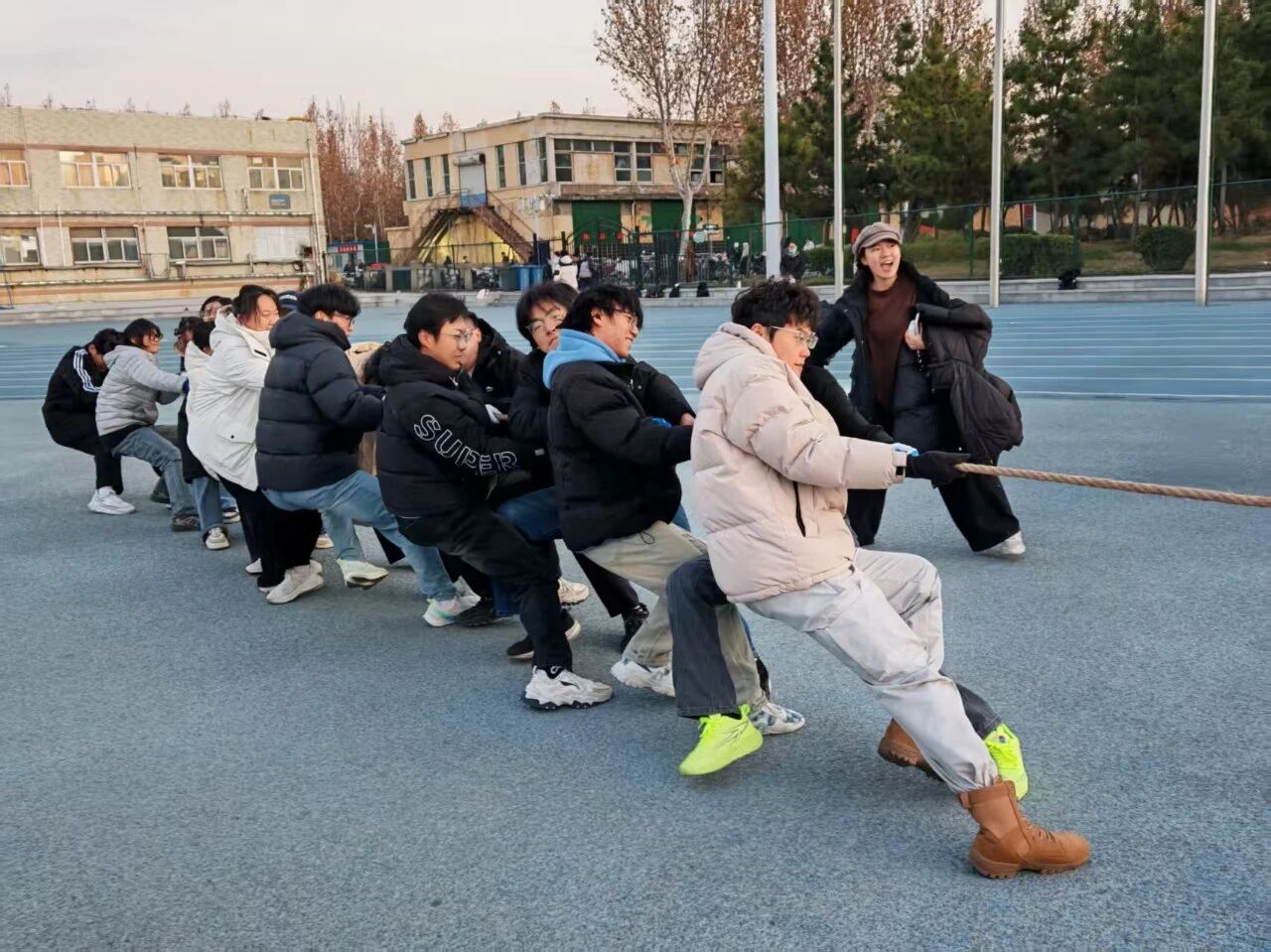 为丰富学生课余生活,培养学生的团队协作意识,12月4日, 杏吧 于田径场举办“聚力杯”拔河比赛,2025级学生积极参与其中。
