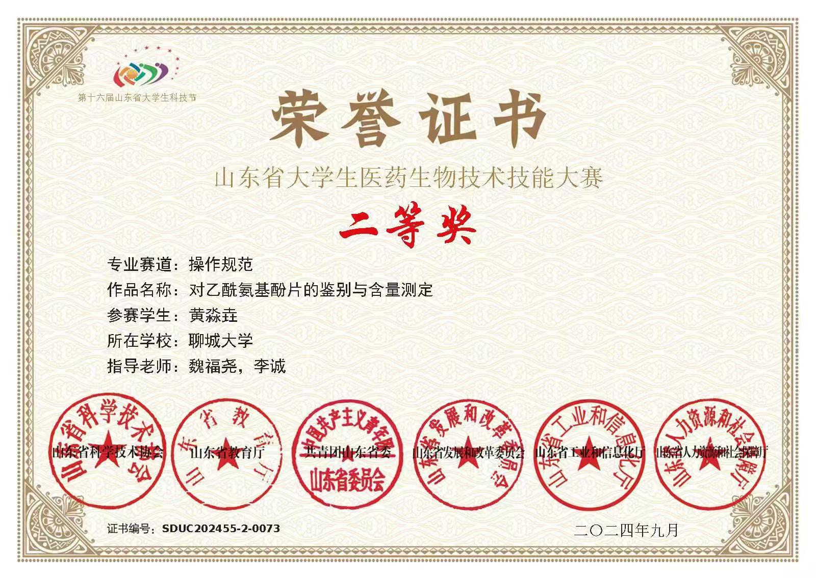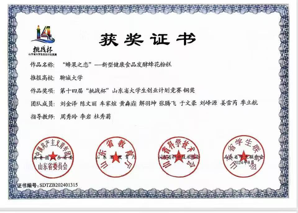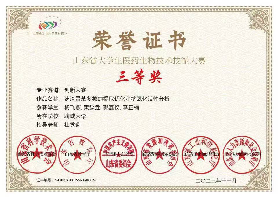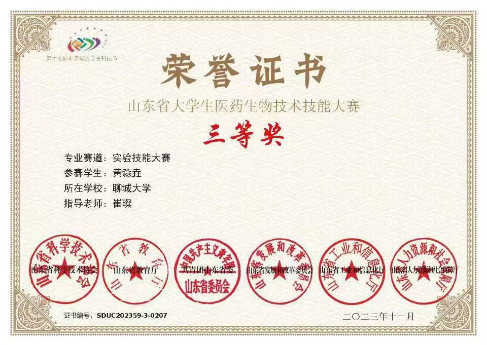 热烈祝贺 杏吧 黄淼垚荣获“山东省大学生生物化学技能与创新创业大赛(2023,创新创业类)”三等奖