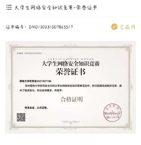 热烈祝贺药学院佟思宜荣获“全国大学生网络安全知识竞赛”荣誉证书