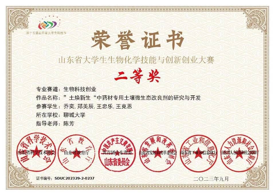 热烈祝贺药学院王忠乐荣获“第十五届科技节山东省大学生生物化学技能与创新创业大赛”二等奖