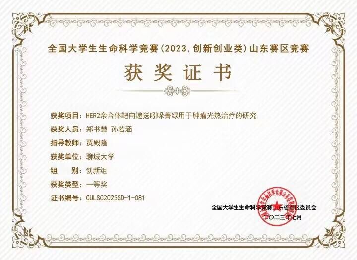 热烈祝贺药学院孙若涵荣获“全国大学生生命科学竞赛(2023,创新创业类)山东赛区竞赛”一等奖