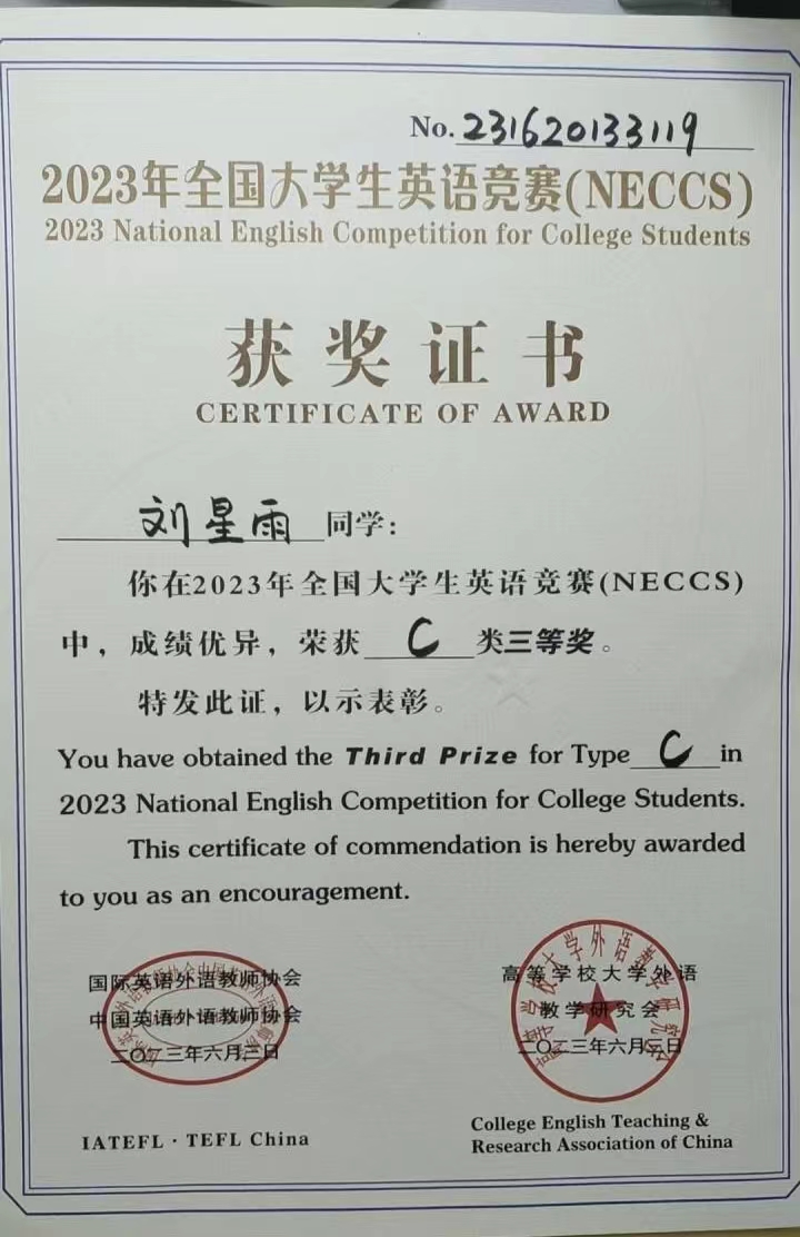 热烈祝贺药学院刘星雨荣获“全国大学生英语竞赛”三等奖