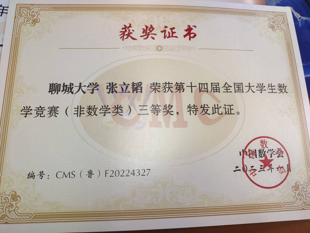 热烈祝贺药学院张立韬荣获“全国大学生数学竞赛”三等奖