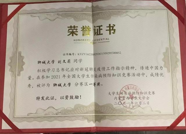 热烈祝贺药学院刘文莉荣获“全国大学生传染病预防知识竞赛”一等奖