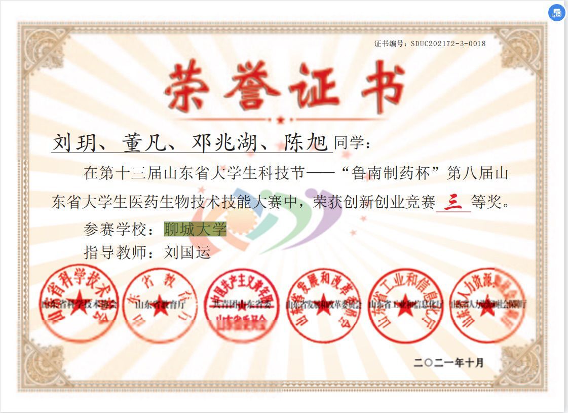热烈祝贺药学院陈旭荣获第十三届山东省大学生科技节“鲁南制药杯”第八届山东省大学生医药生物技术技能大赛创新创业竞赛三等奖
