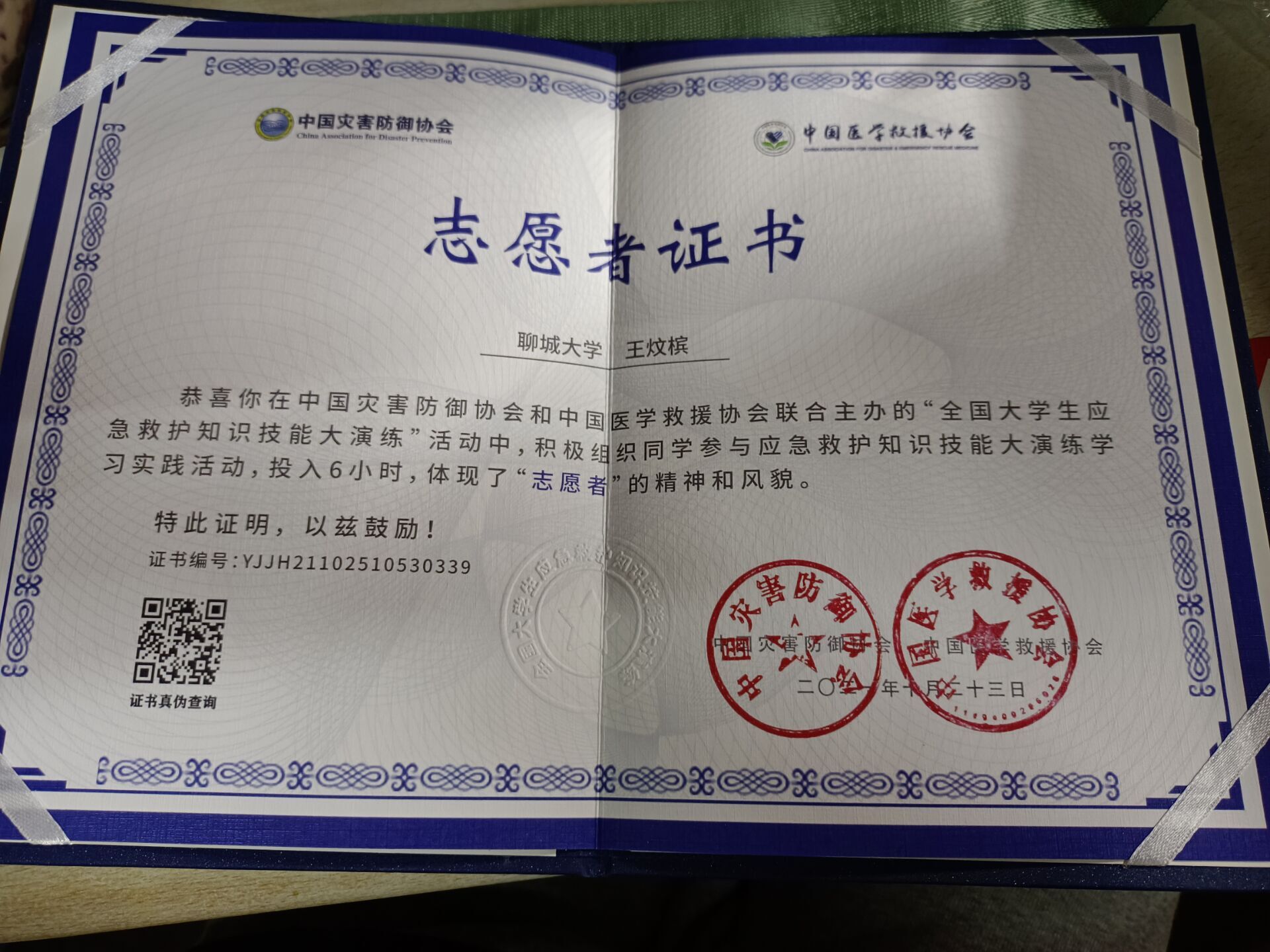 热烈祝贺药学院王炆槟荣获“全国大学生应急救护知识大演练”志愿者证书