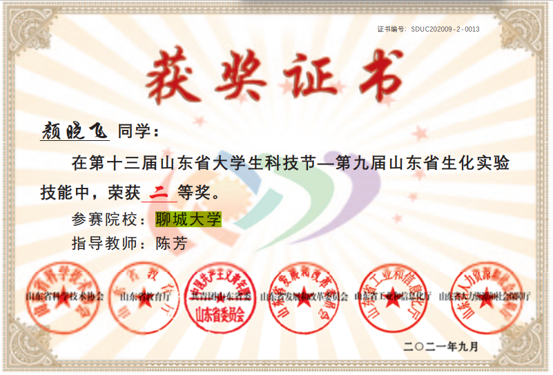热烈祝贺药学院颜晓飞荣获第十三届山东省大学生科技节第九届山东省生化实验技能二等奖