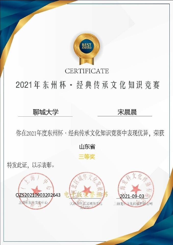 热烈祝贺药学院宋晨晨荣获2021年东州杯·经典传承文化知识竞赛三等奖