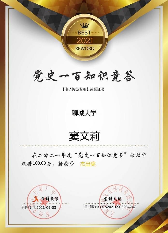 热烈祝贺药学院窦文莉荣获2021年党史一百知识竞答杰出奖