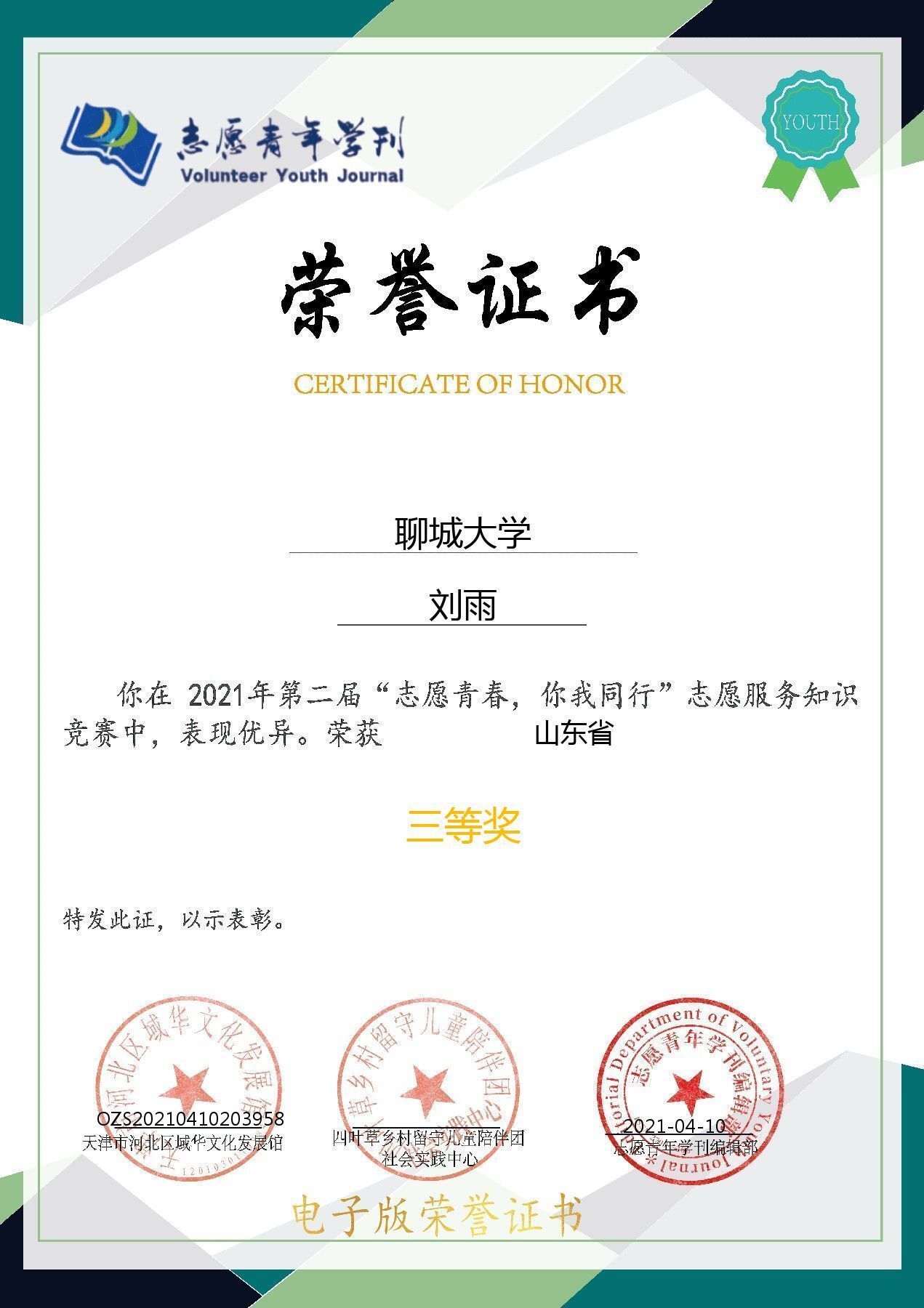 热烈祝贺药学院刘雨荣获第二届“志愿青春,你我同行”志愿服务知识竞赛三等奖