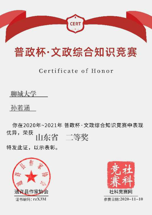 杏吧 孙若涵获“普政杯文政综合知识竞赛”二等奖