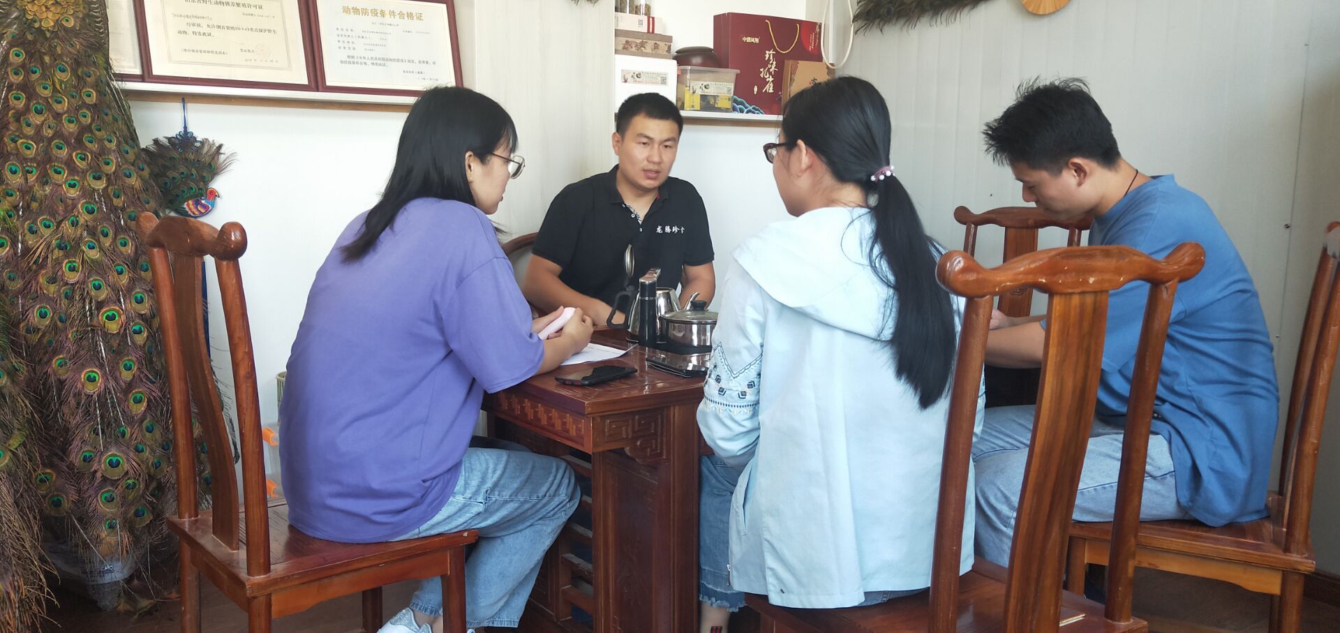 团队成员首先来到单县莱河镇刘庄村,询问村民关于直播带货与电商对自身生活造成的影响,以及近年来的乡村变化与乡村建设。他们了解到,村子里有许多精准扶贫与刚刚脱贫的家庭,如果没有直播带货,可能会出现贫困更贫,脱贫返贫的状况。受疫情影响,村子里积压了数吨鸡蛋,村民们通过直播带货、电商销售等方式才使得这些农产品顺利卖出。随后,团队成员跟随村长前往种植及养殖地点了解生产情况。村长告诉他们,直播带货让田间地头摇身变成直播间,消费者能直观看到农产品原产地种植状况,从而对产品质量放心。电商平台帮助消费者拓宽购买渠道,使得优质的农产品更具有销路。之后,部分团队成员前往阳谷县龙腾珍禽养殖有限公司。该公司总经理为杏吧 2003级毕业生刘令荣,他放弃了安定的工作,返乡创业。该公司不仅免费给周围养殖户提供技术支持,带动着周围农户的脱贫攻坚,还以直播带货、电商销售的方法,拓宽了销售渠道,解决了疫情期间的产品滞销问题,有力地促进了当地乡村的经济振兴。