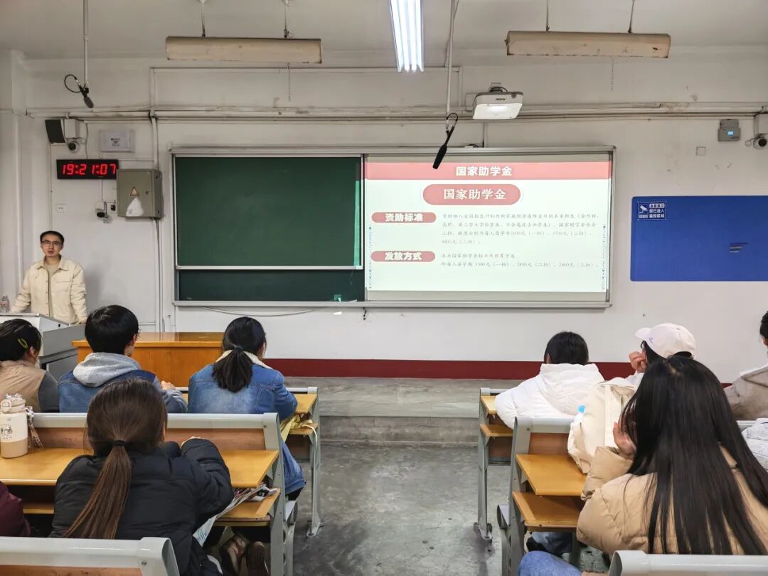 徐致远聚焦政策核心要求,系统梳理了各类资助、奖励项目的评定原则与量化标准,从申报资质审核、综合表现考评到材料规范提交等关键环节,为同学们进行了条理清晰的阐释说明。针对国家奖学金、国家助学金这两项资助项目,徐致远深入解读了政策核心要义,详细点明了具体规范,为同学们精准掌握政策要点、规范开展申报工作提供了指导。随后,他为同学们深入阐释了资助在成长路上的独特价值与深远意义,让同学们感受到了学校与社会的关怀,进一步激发了同学们内心的感恩之心与奋进之志。活动结束后,同学们纷纷表示,将铭记国家与学校的关心扶持,把政策关怀转化为成长成才的强大动力,始终坚守理想信念、脚踏实地钻研学业,以优异的成绩与过硬的本领不负时代重托。