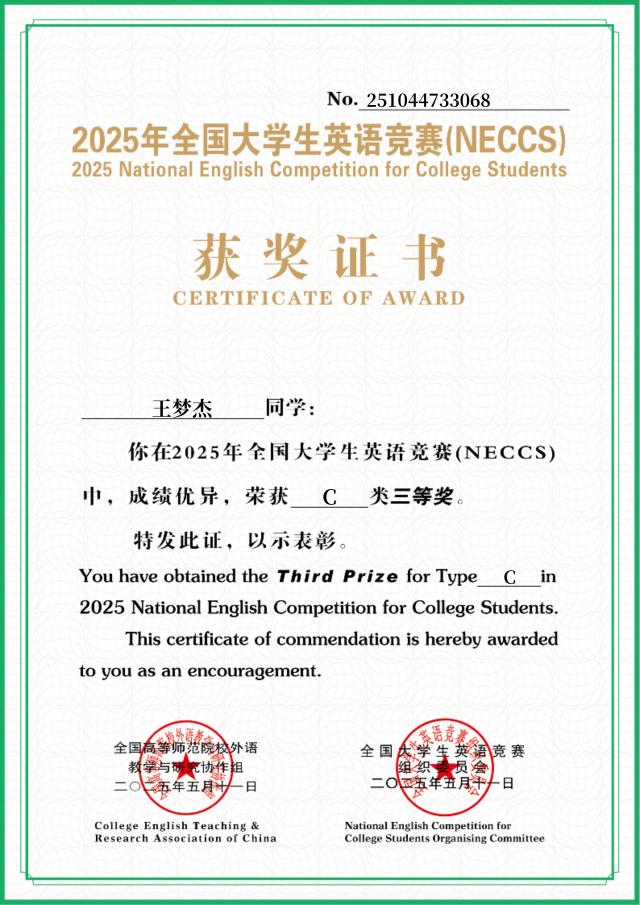 热烈祝贺 杏吧 王梦杰荣获2025年全国大学生英语竞赛(NECCS)C类三等奖