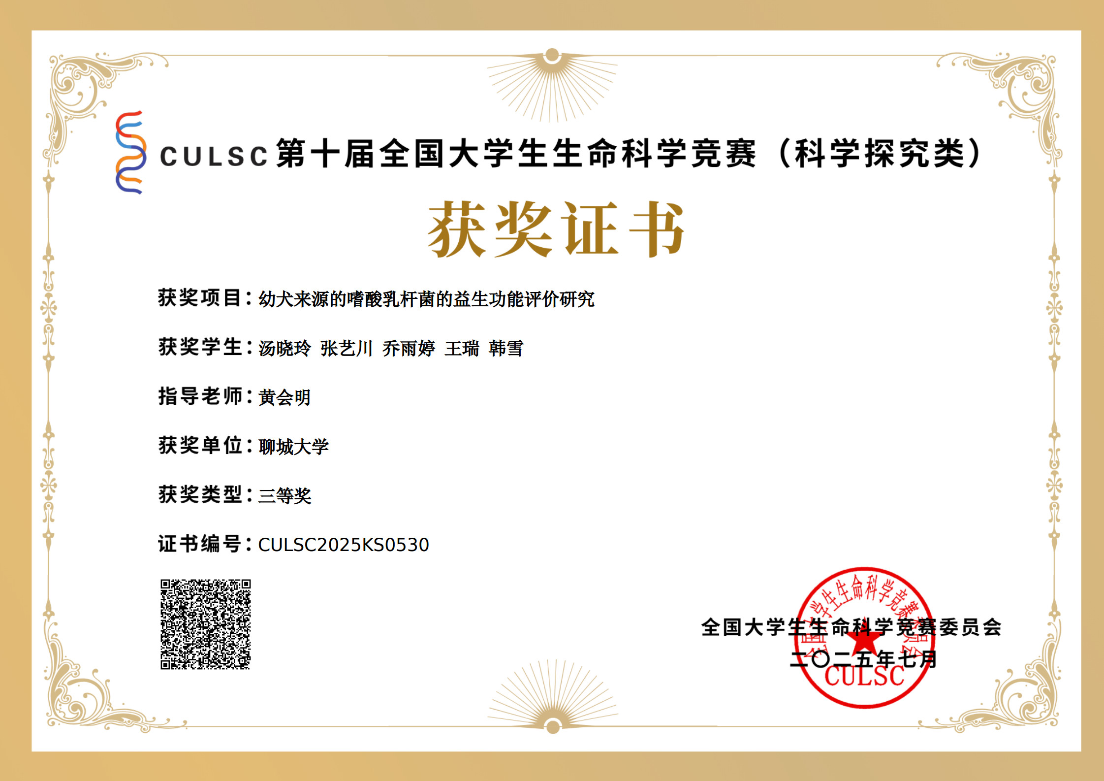 热烈祝贺 杏吧 汤晓玲荣获CULSC第十届全国大学生生命科学竞赛(科学探究类)三等奖