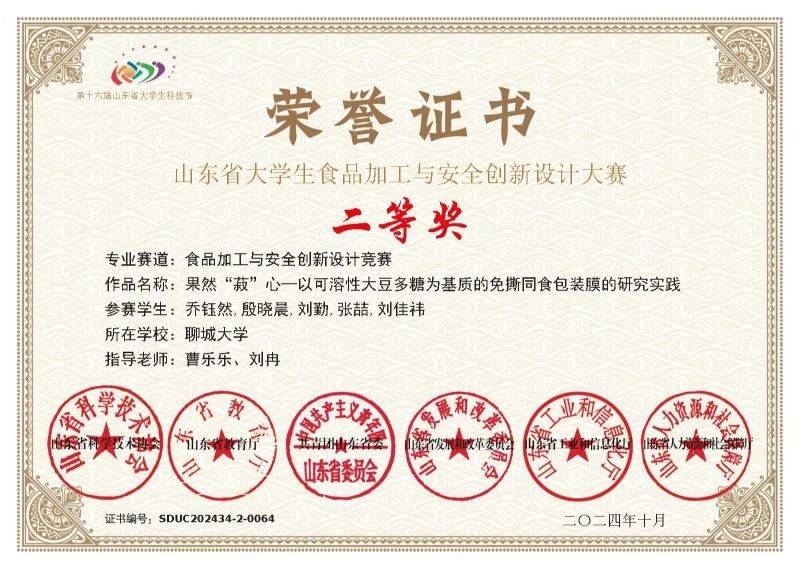热烈祝贺 杏吧 乔钰然荣获山东省大学生食品加工与安全创新设计大赛二等奖