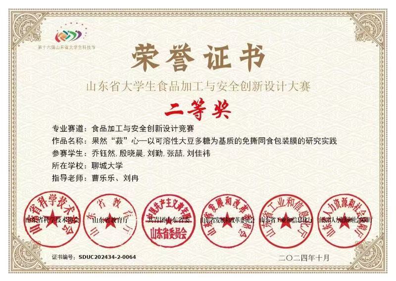 热烈祝贺 杏吧 刘勤荣获山东省大学生食品加工与安全创新设计大赛二等奖