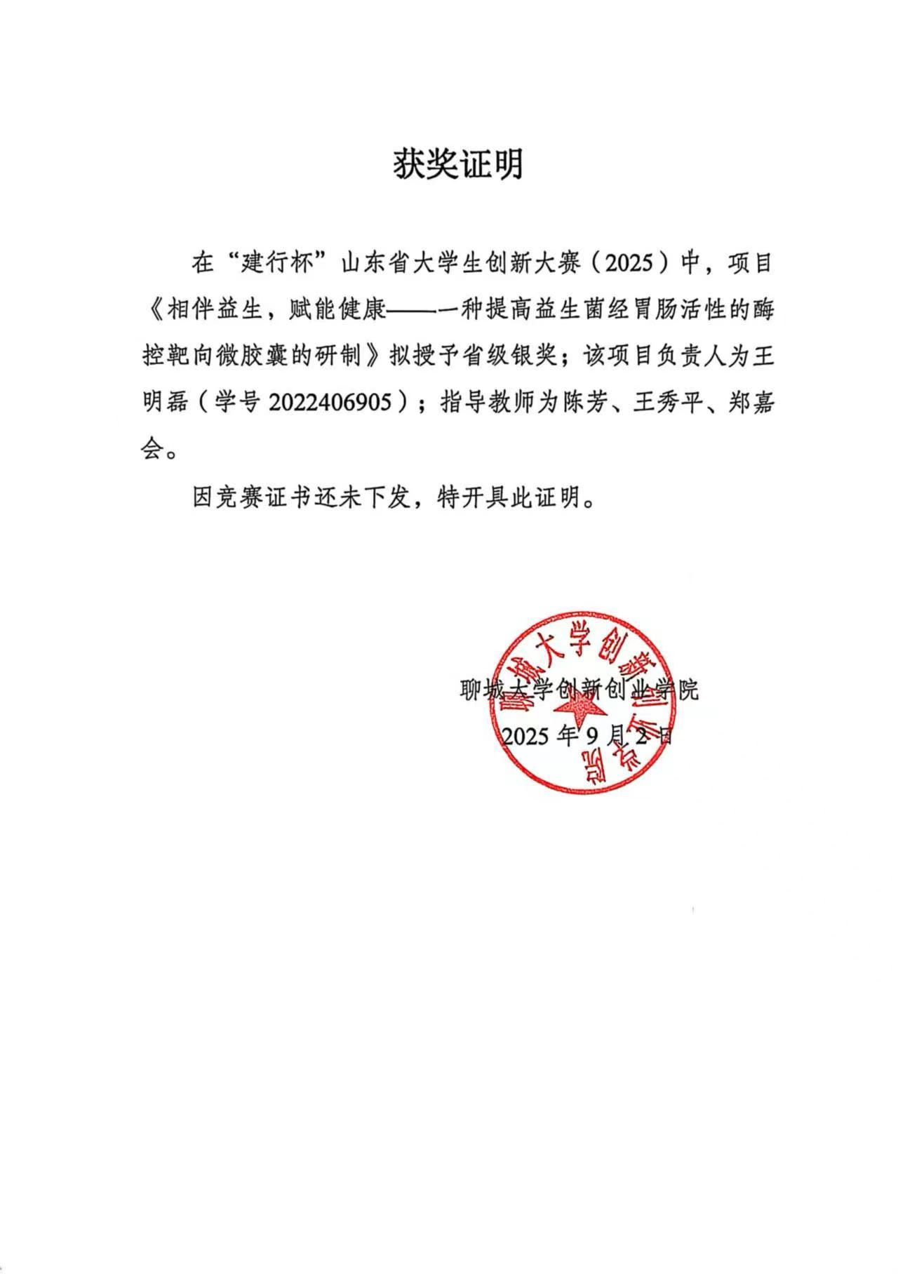 热烈祝贺 杏吧 张家硕荣获“建行杯”山东省大学生创新大赛(2025)省级