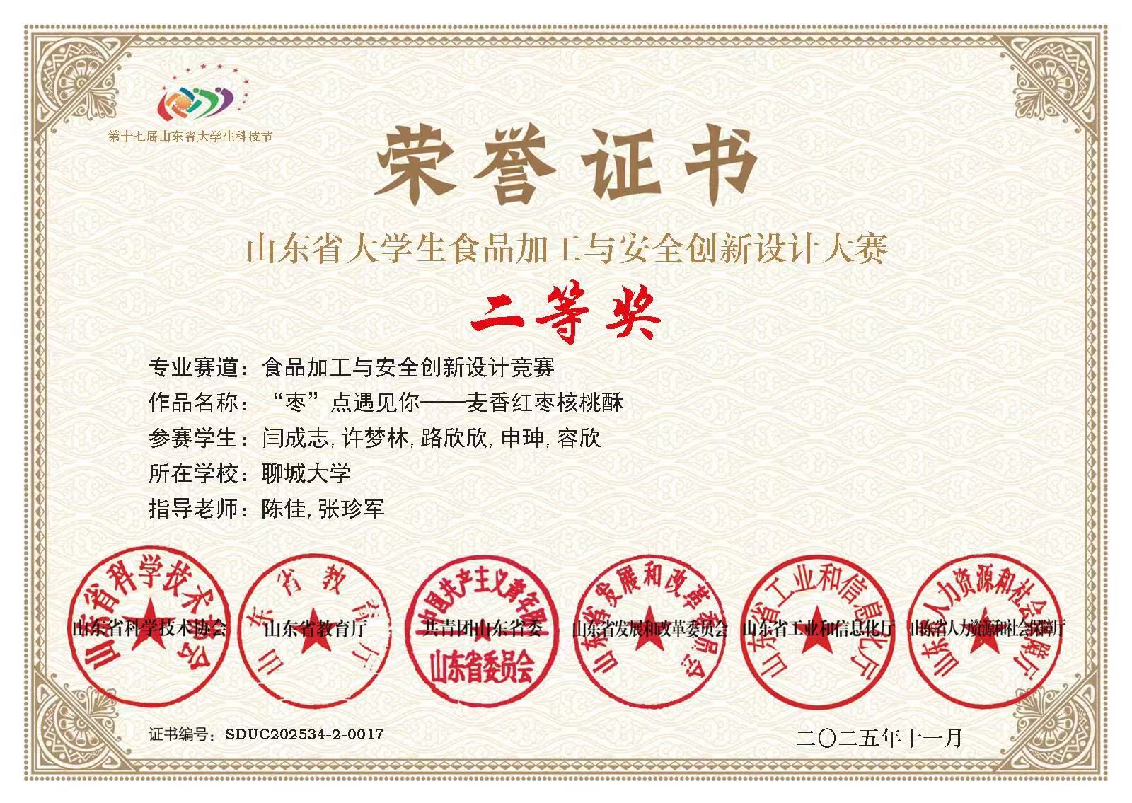 热烈祝贺 杏吧 申珅荣获山东省大学生食品加工与安全创新设计大赛二等奖