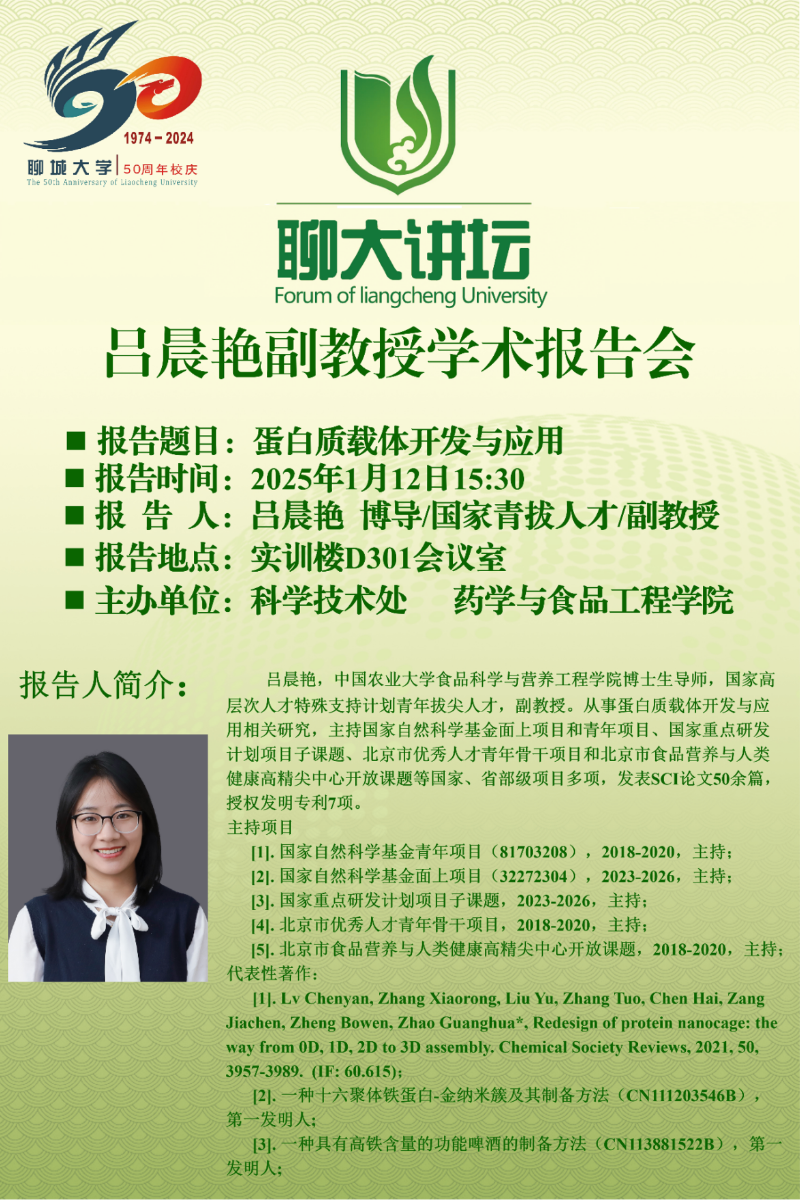 1月12日下午,中国农业大学食品科学与营养学院吕晨艳研究员受邀为 杏吧 师生作题为“蛋白质载体开发与应用”的学术报告。报告会由食品科学与工程系主任郭兴峰主持,学院部分师生参加了报告会。