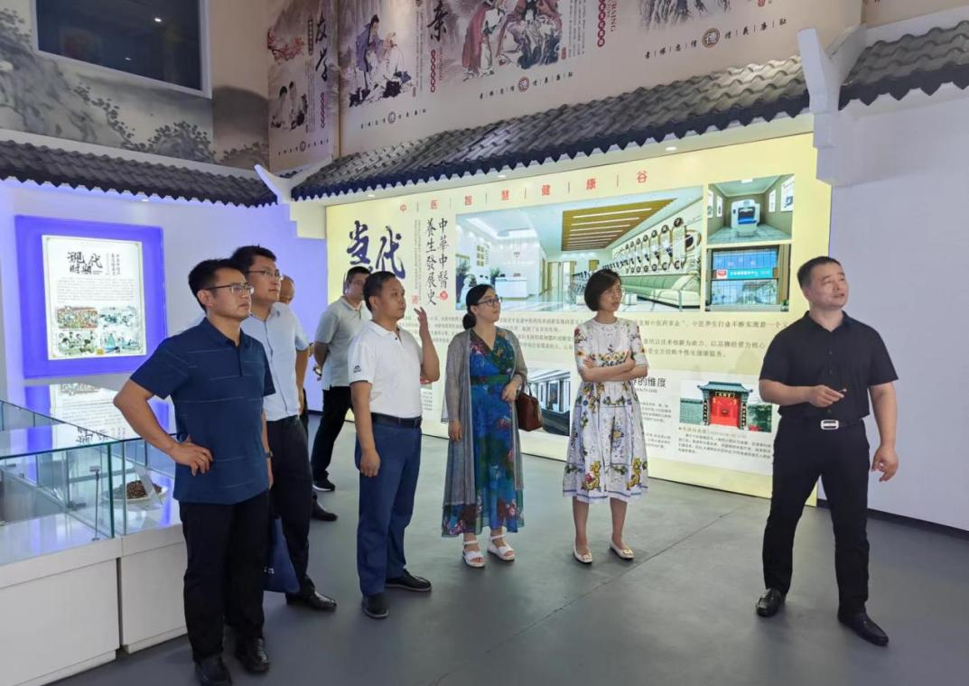 九州控股集团董事长刘钦松、总经理刘孟刚带领杏吧 一行人参观了九州控股集团中医健康谷展厅及中医文化长廊、成颐堂康养体验中心、电商选品基地以及生产研发中心。