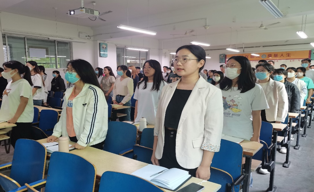 大会进行第一项:全体起立,奏唱国歌。