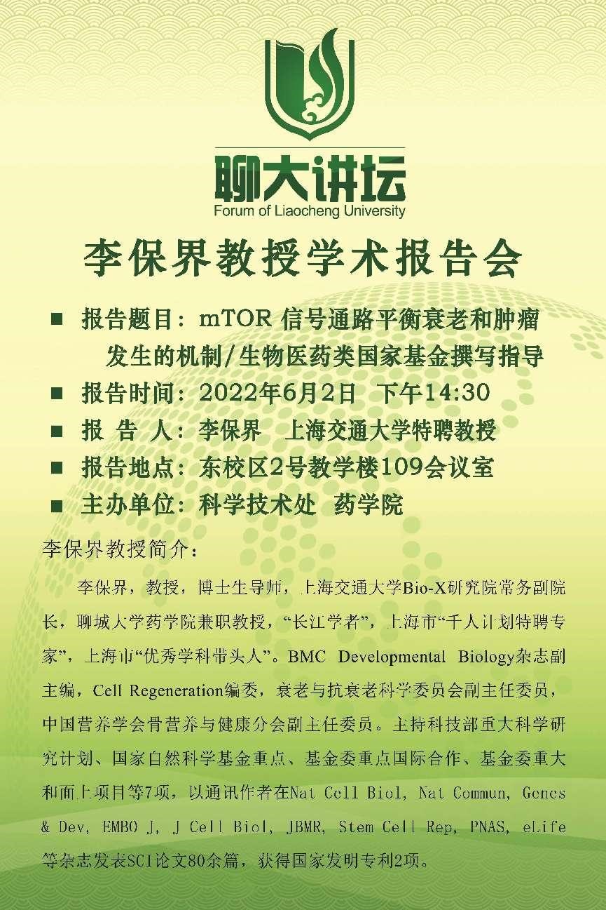 6月2日,上海交通大学李保界教授应邀做客线上聊大讲坛,通过视频会议的方式作了题为《mTOR信号通路平衡衰老和肿瘤发生的机制/生物医药类国家基金撰写指导》的报告。报告会由药学院院长冀芦沙主持,药学院全体教师参加。