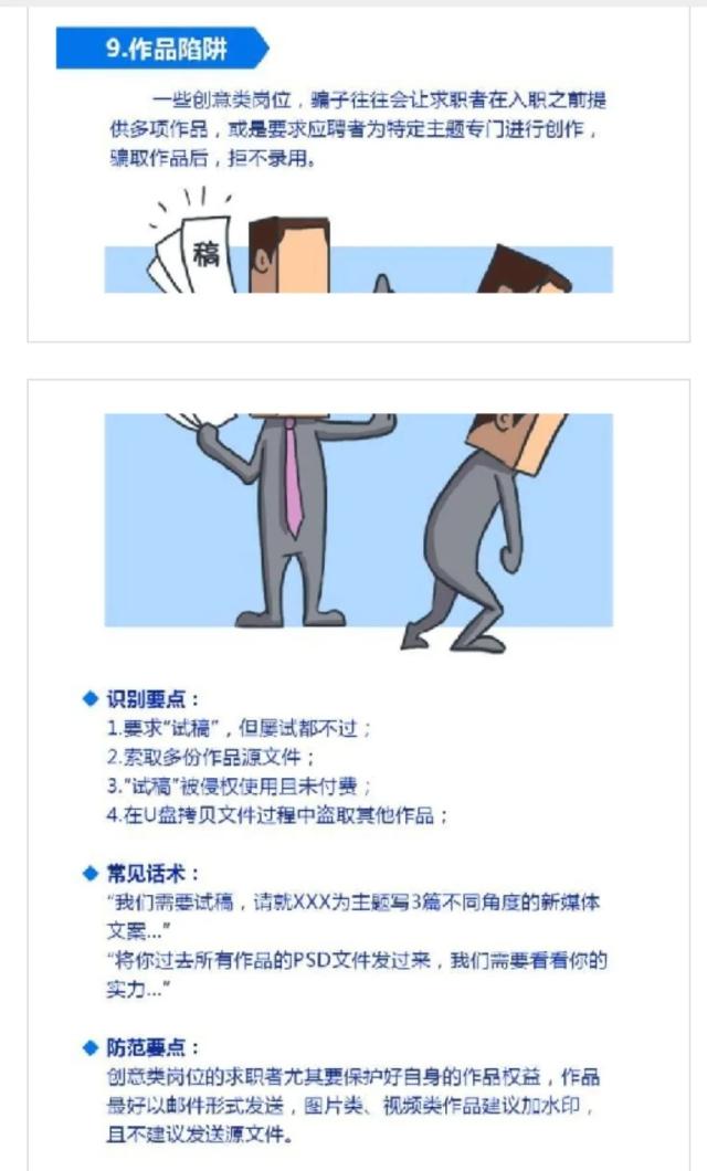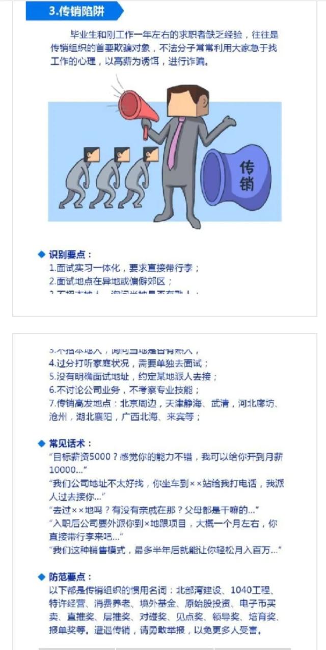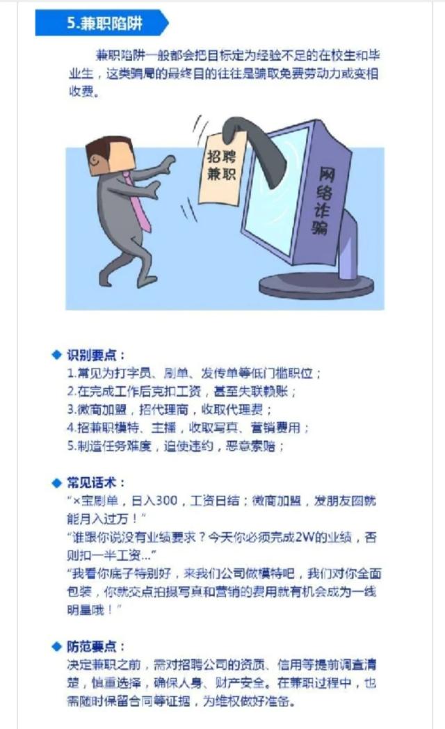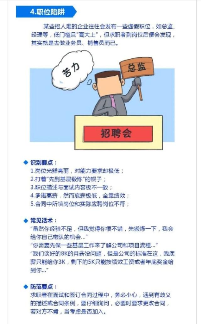 总结来说几乎所有招聘陷阱都是利用求职者迫切希里得到高院工作的心理,对防骗意识较差,防骗常识较弱的求职者进行诈骗行为。而在上当之前,我们是有机会发现井避免的。